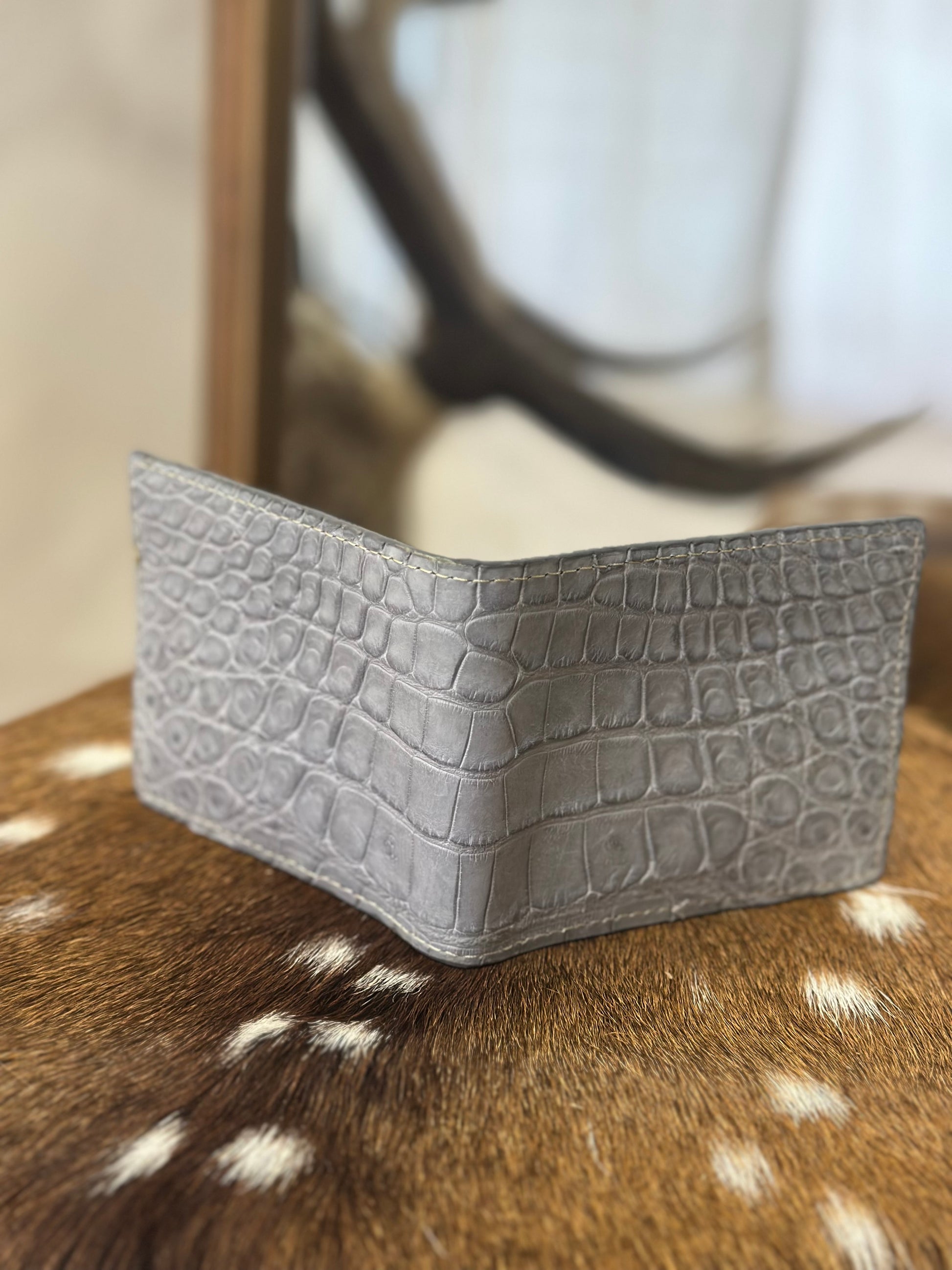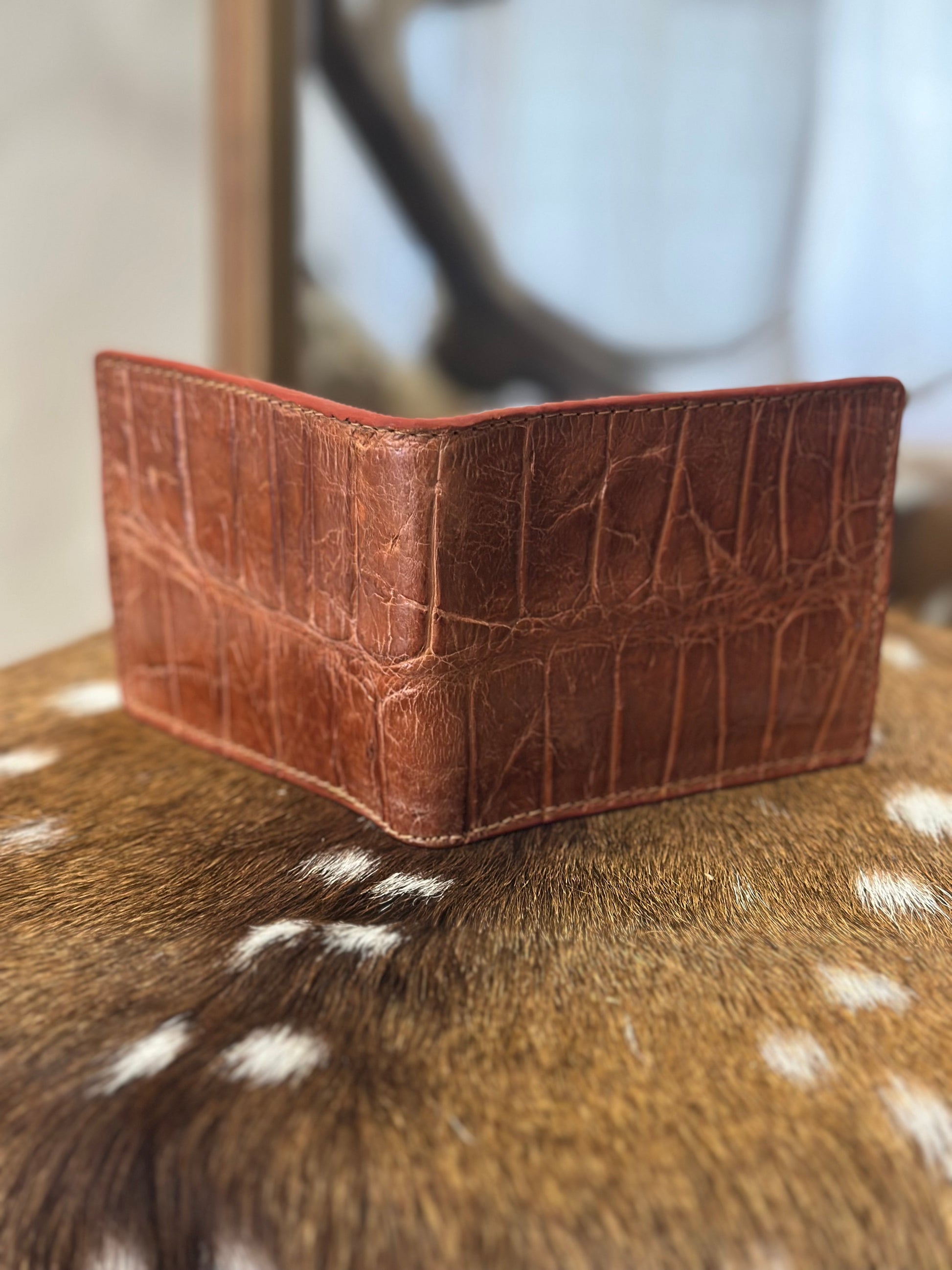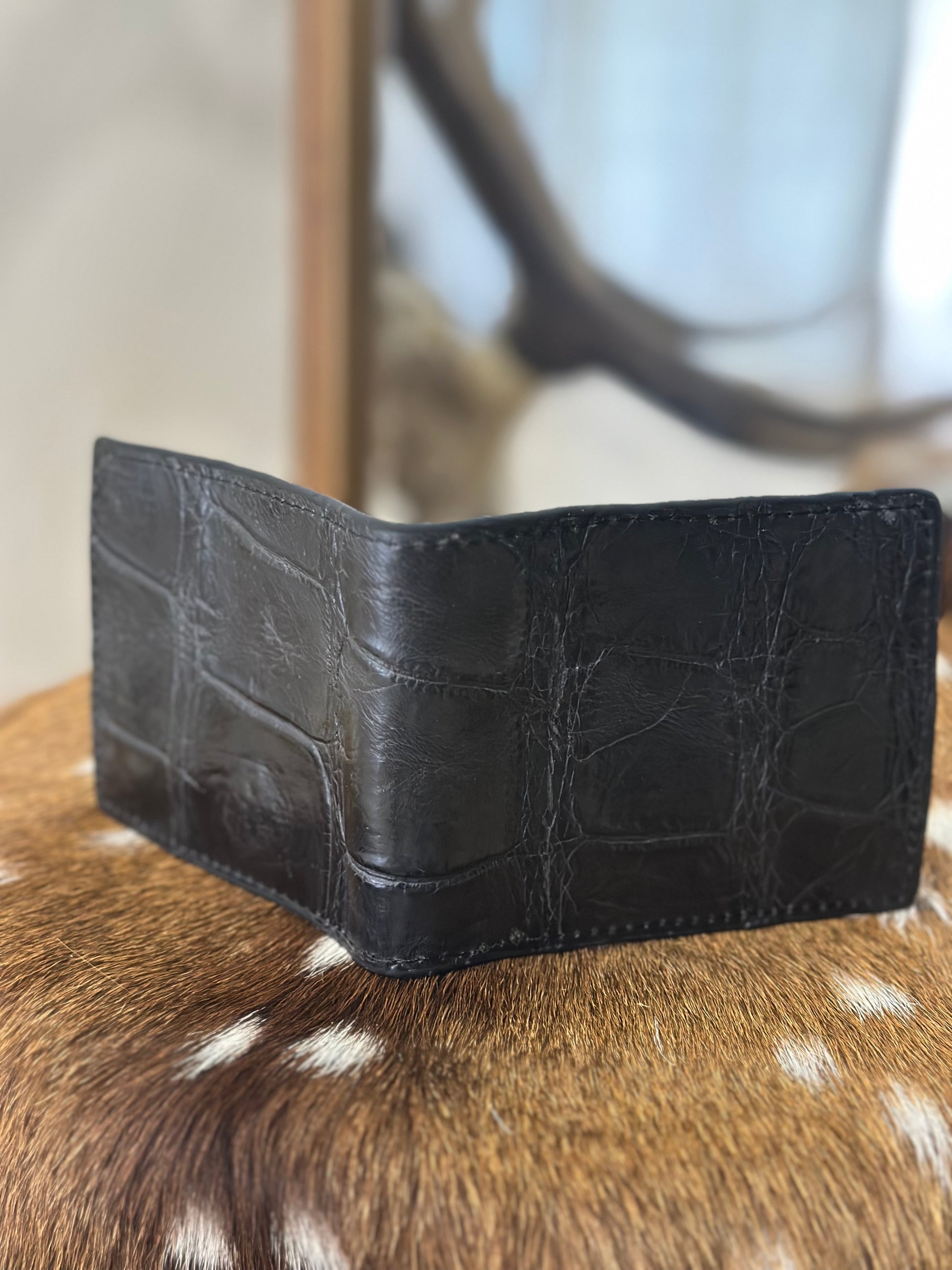 This genuine alligator hide bifold wallet blends timeless style with everyday functionality. Handcrafted from exotic leather, it features double cash slots and ample card storage, making it as practical as it is refined. Built to last, this wallet is a statement piece of true craftsmanship and luxury.