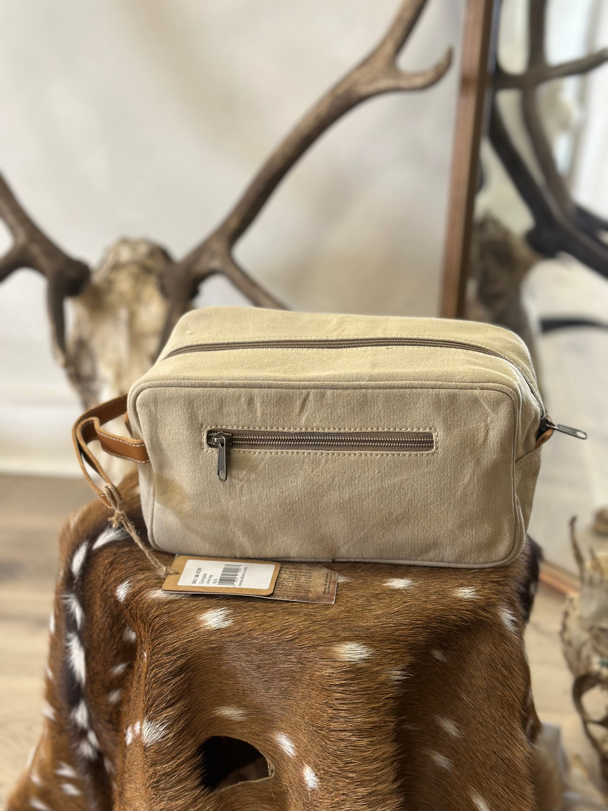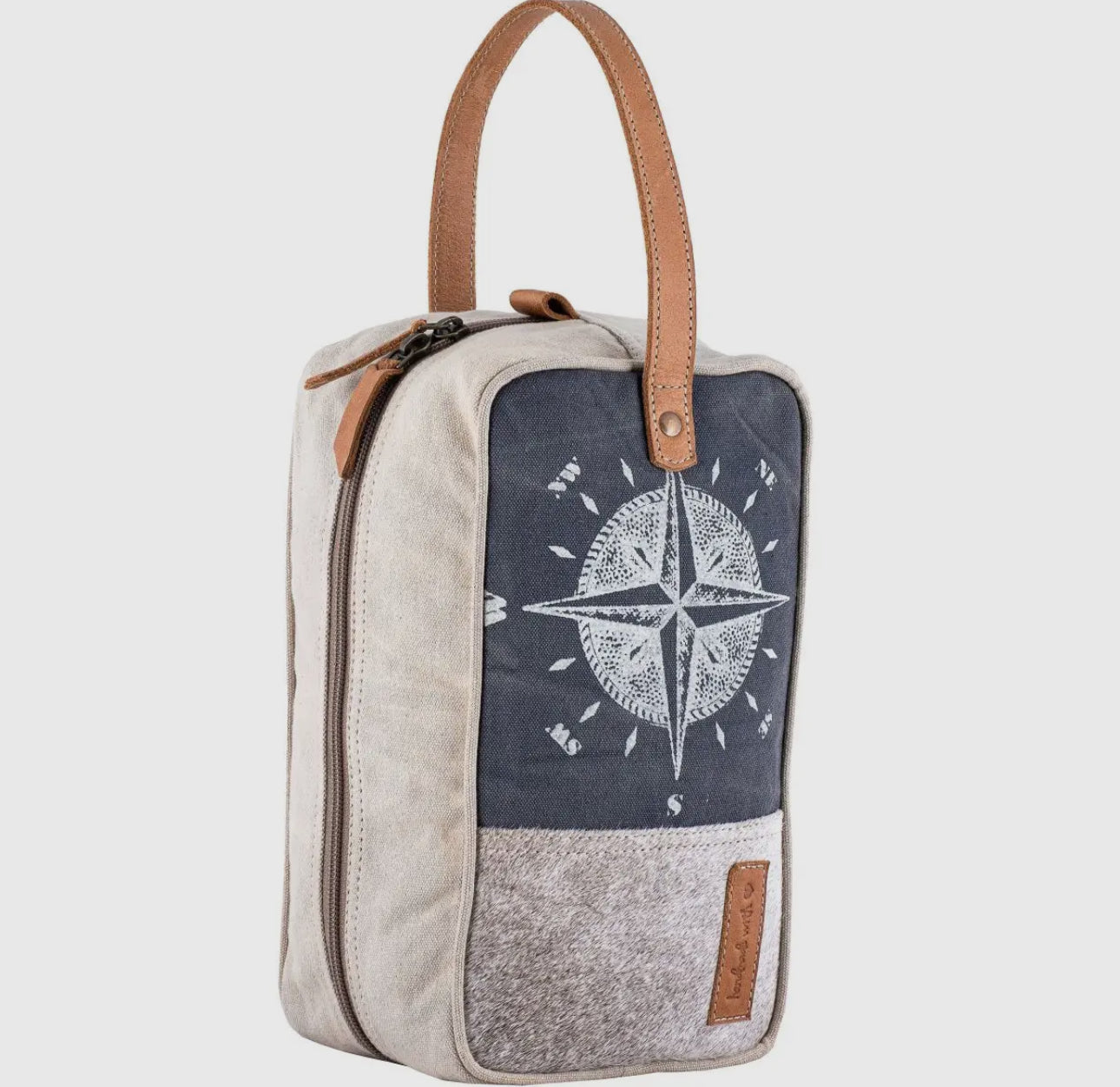 Adventure-ready and built to last, this men’s shave kit keeps your grooming essentials organized in rugged style. Crafted from durable canvas with genuine leather accents, it’s designed to handle life on the road or at home. The front features a bold compass rose design, symbolizing exploration and direction, paired with a cowhide accent for a refined finish.