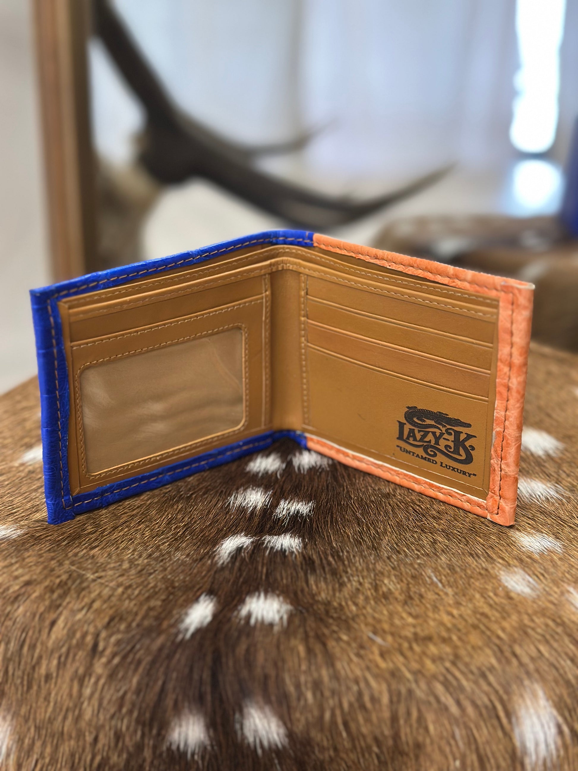Crafted from genuine alligator hide, this one-of-a-kind wallet showcases bold orange and blue hides in tribute to the University of Florida Gators. The design combines luxury with functionality, featuring dual cash slots, generous card storage, and a clear ID window for easy access. Built from exotic materials and finished with meticulous attention to detail, this piece is both a statement of school pride and a timeless accessory for everyday use.