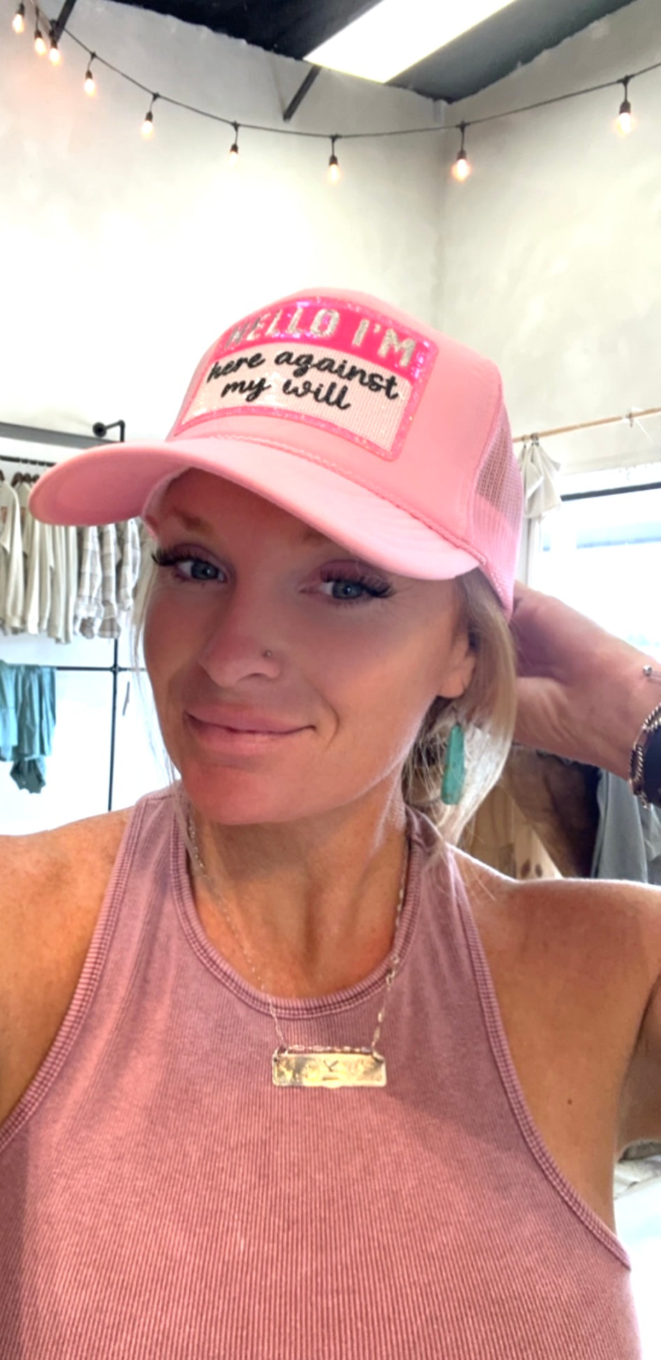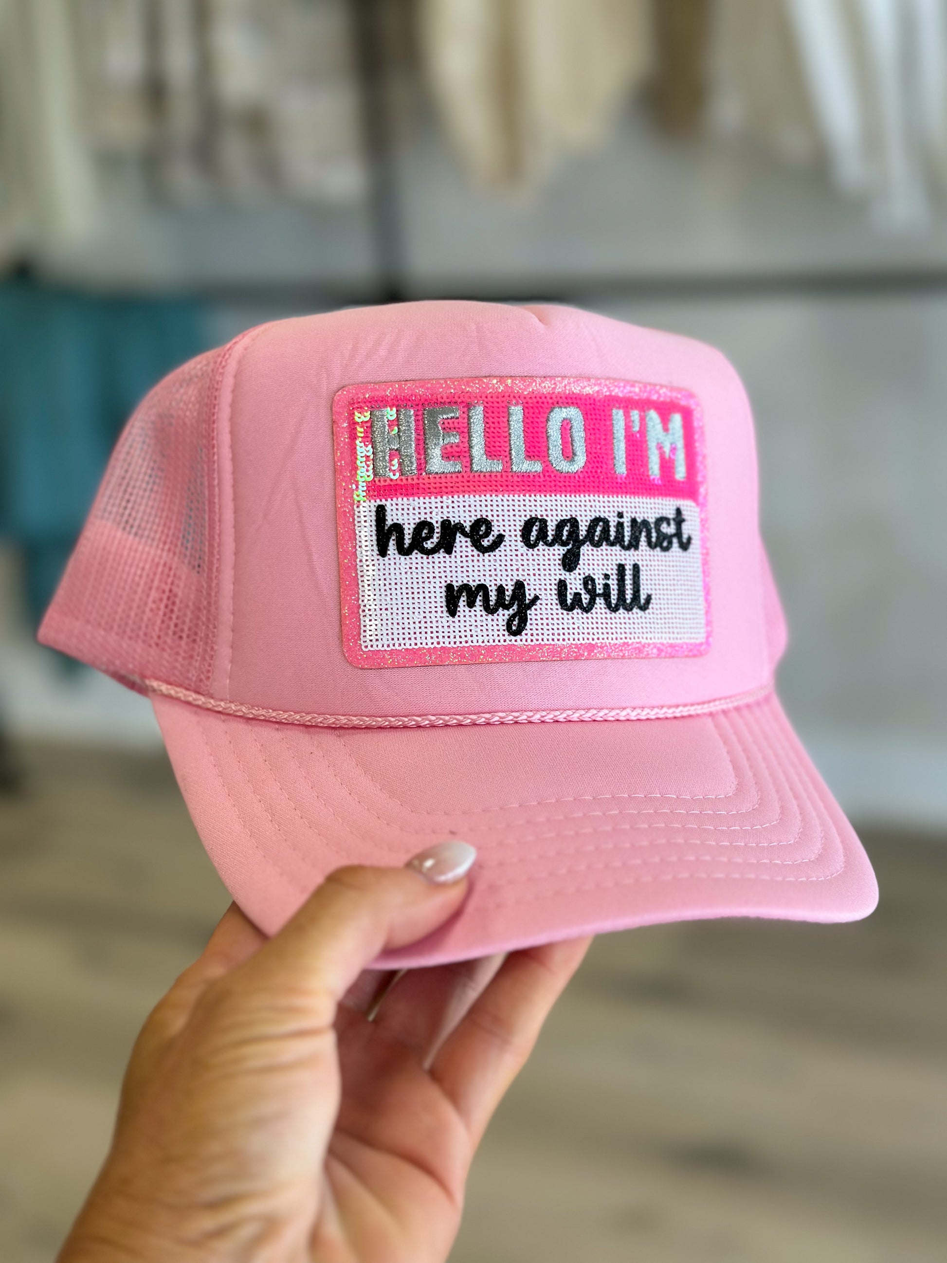 “HELLO I’M here against my will” — in shimmering pink and silver sequins with bold black embroidery.