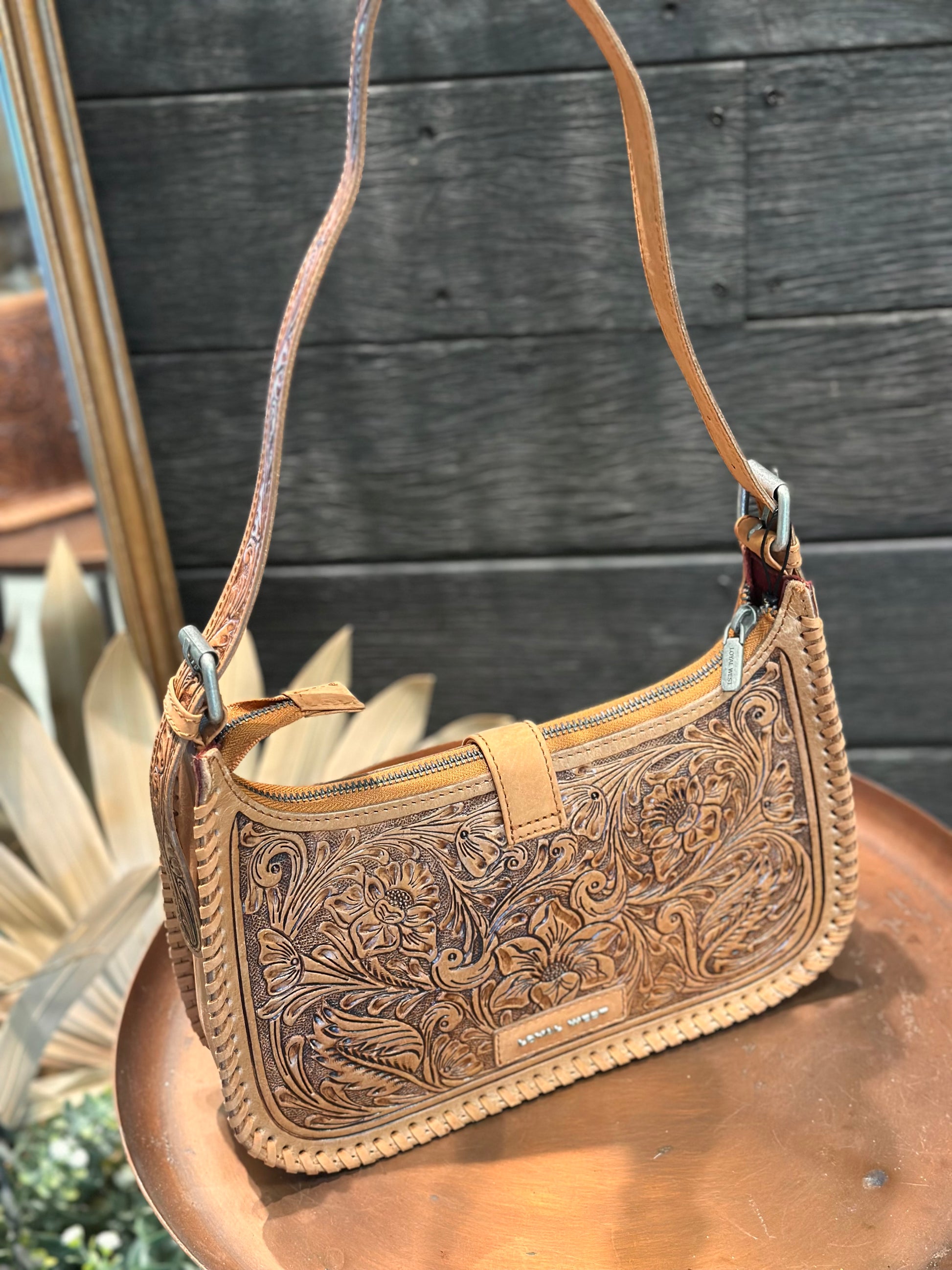 The Dannia Medium Purse is a beautifully crafted shoulder bag that combines rich brown handtooled leather with soft, smooth calfskin. The intricate handtooling adds a unique, artisanal touch, giving this bag an elegant and timeless appeal.