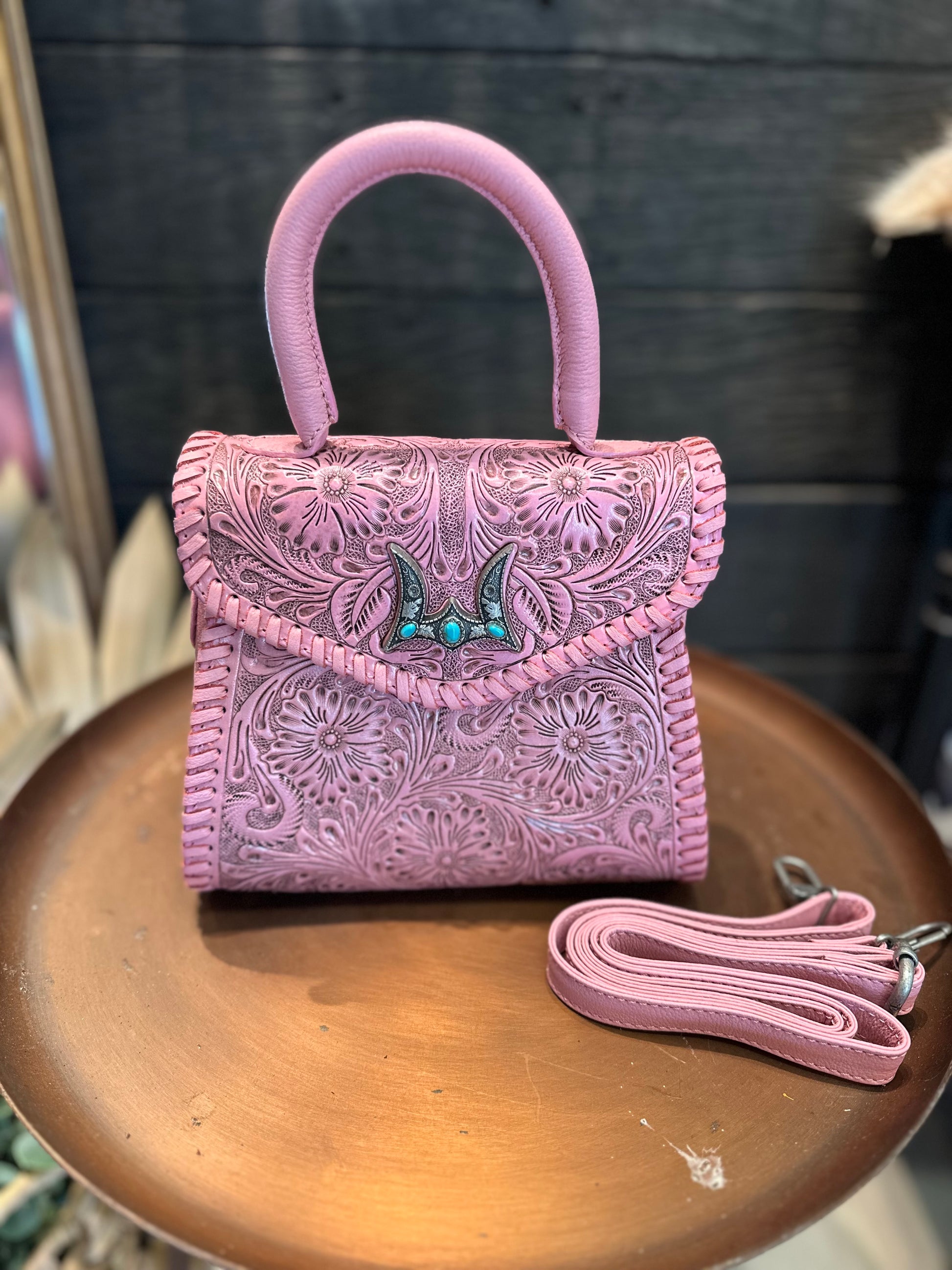Crafted from premium calfskin, this pink mini purse features exquisite hand-tooled detailing, combining elegance with durability. Its compact design and fine craftsmanship make it a timeless statement piece. Soft velvet interior