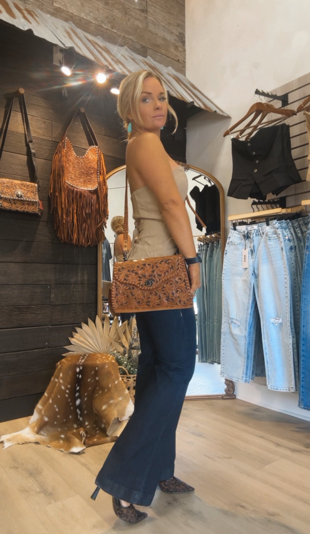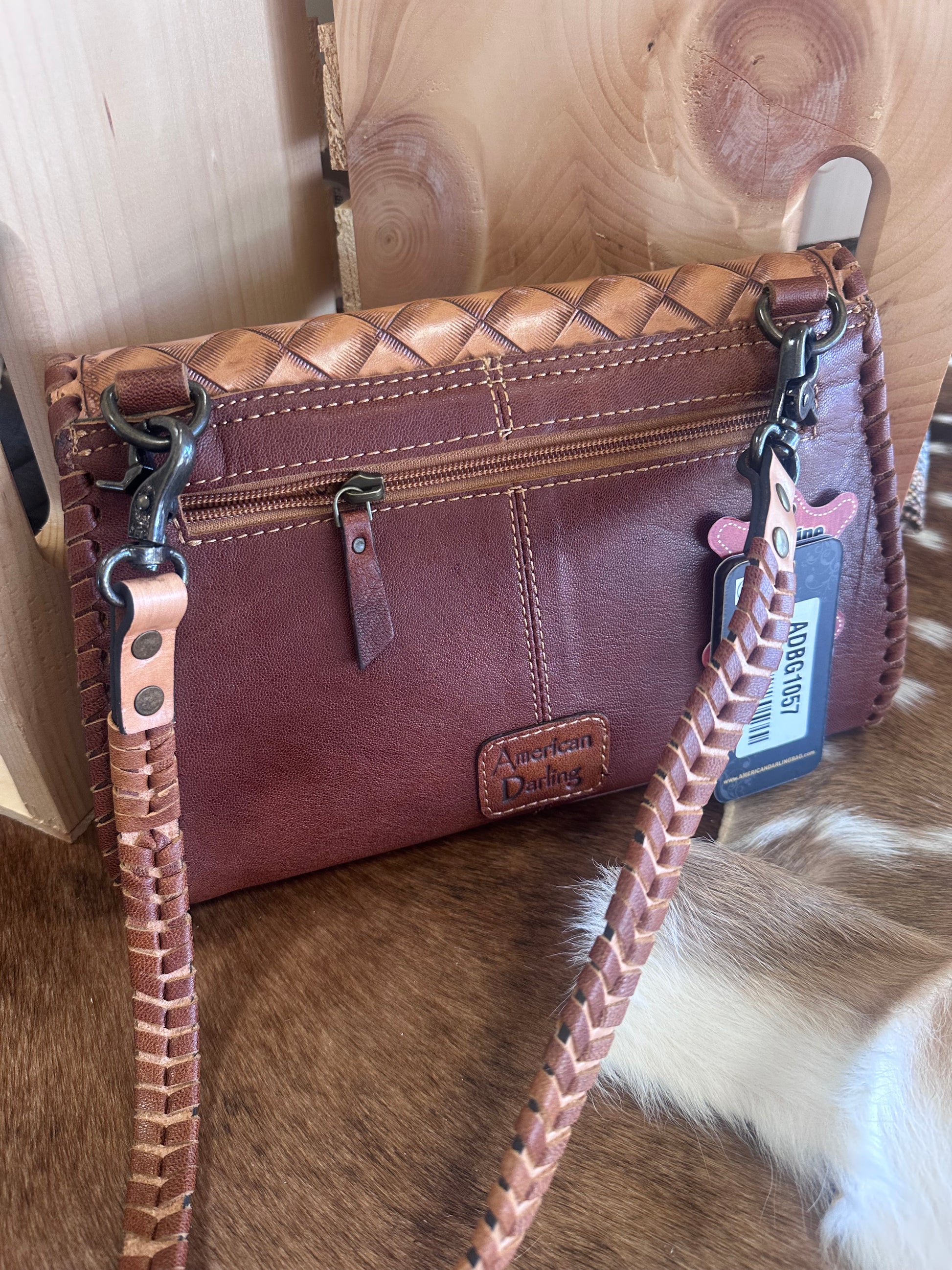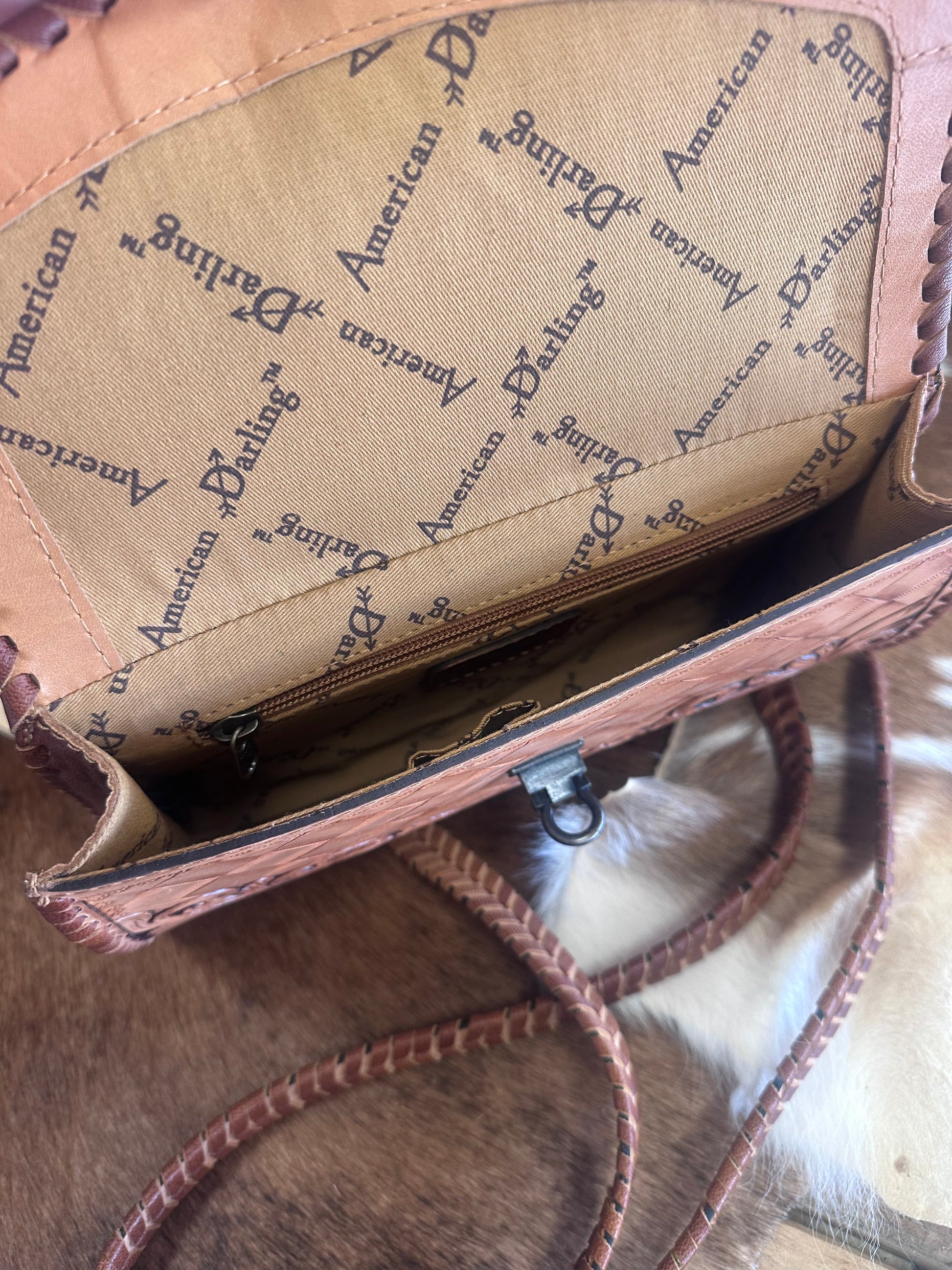 - Hand-tooled floral leather exterior, with zipper pocket on back
