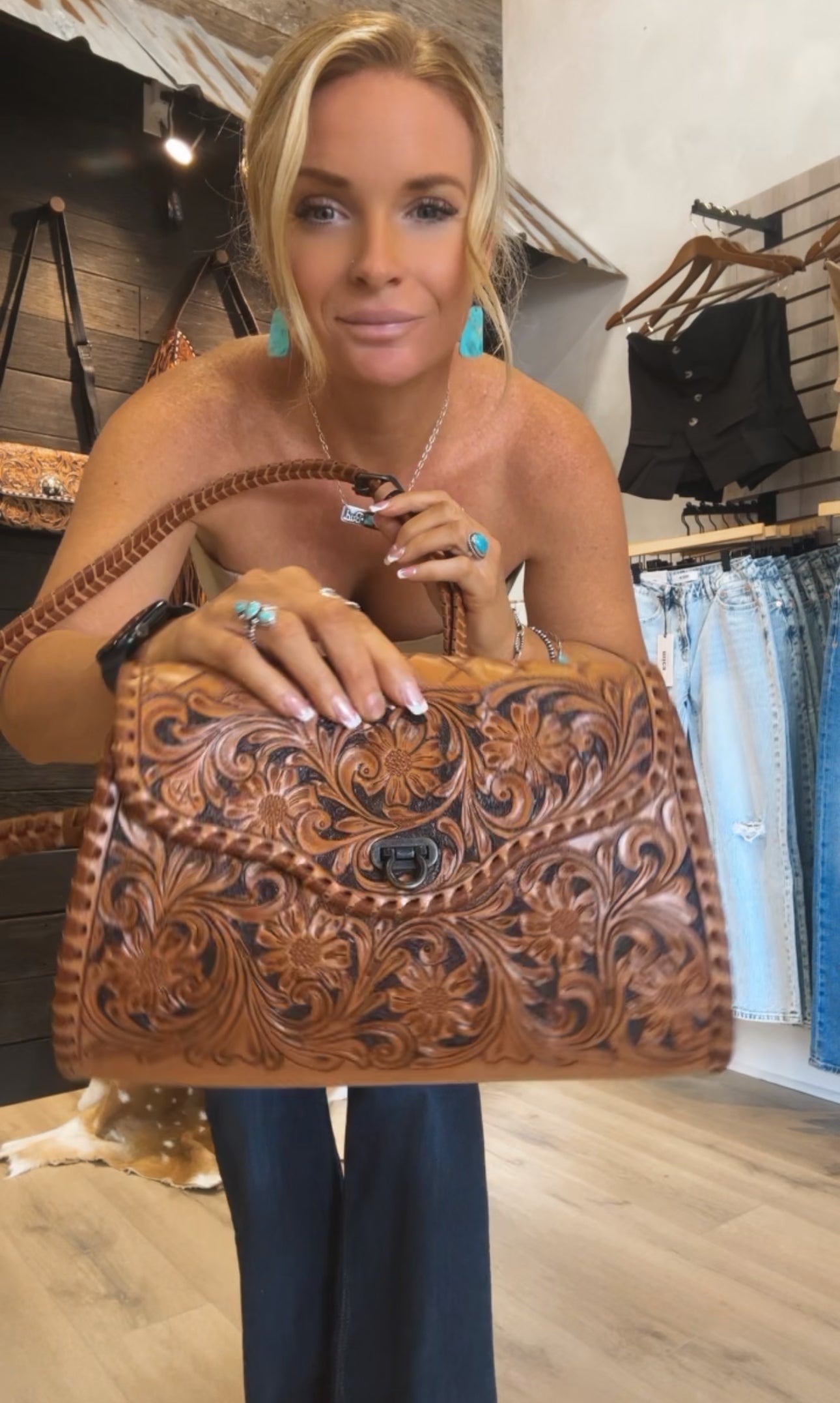 This beautifully handcrafted leather purse showcases intricate floral tooling that brings depth, texture, and artistry to every detail. The warm, rich leather is hand-tooled with a flowing botanical pattern, framed by meticulous hand-laced edges that speak to true Western craftsmanship.